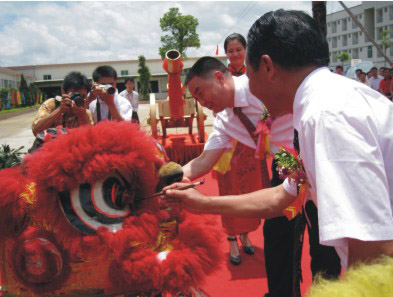 隨后,縣委書記成偉明同志與我司董事長朱日楊先生共同“醒獅點晴”。緊接著,市委書記陳建華、市長劉小華、市政協副主席具鐵祥、縣委書記成偉明、縣長藍岸以及我司董事長朱日楊、總經理朱榮業、生產總監黃偉光、營銷總監陳永輝、總經理助理陳駿良共同為公司新廠投產剪彩。頓時,霸王花新廠鼓樂齊鳴、雙獅躍舞,鳴禮炮則將典禮推向高潮。