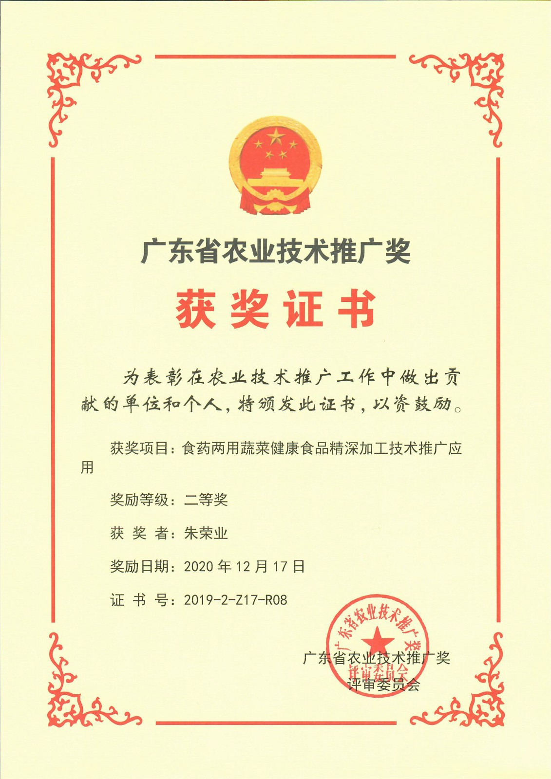 2020年12月,我司"食藥兩用蔬菜健康食品精深加工技術推廣應用"項目榮獲“廣東省農業技術推廣獎”二等獎。